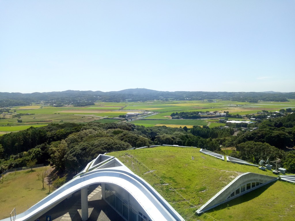 在仿照彌生時代的起伏地形製作而成的屋頂上鋪設草皮,中間像塔一樣的建築最高層樓是瞭望台。